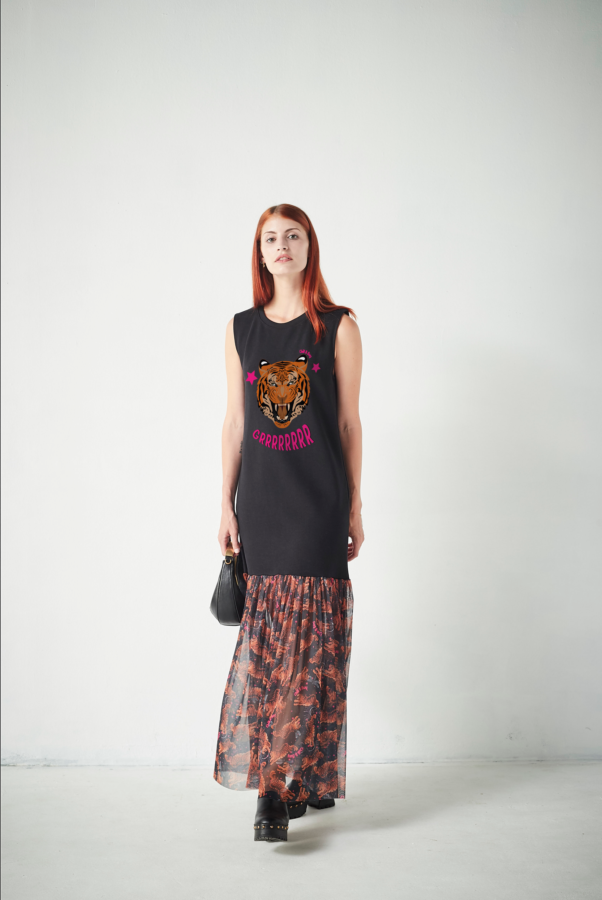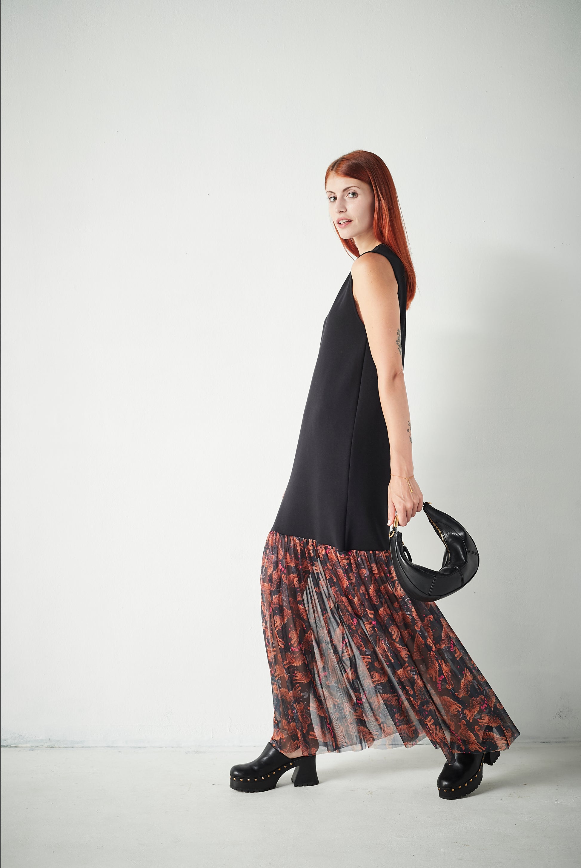 Vestido largo de punto con escote redondo, corte recto y manga sisa. Bajo con tejido combinado en tonos camel confeccionado con hilatura de tul blando. Pieza elaborada íntegramente en Vigo.