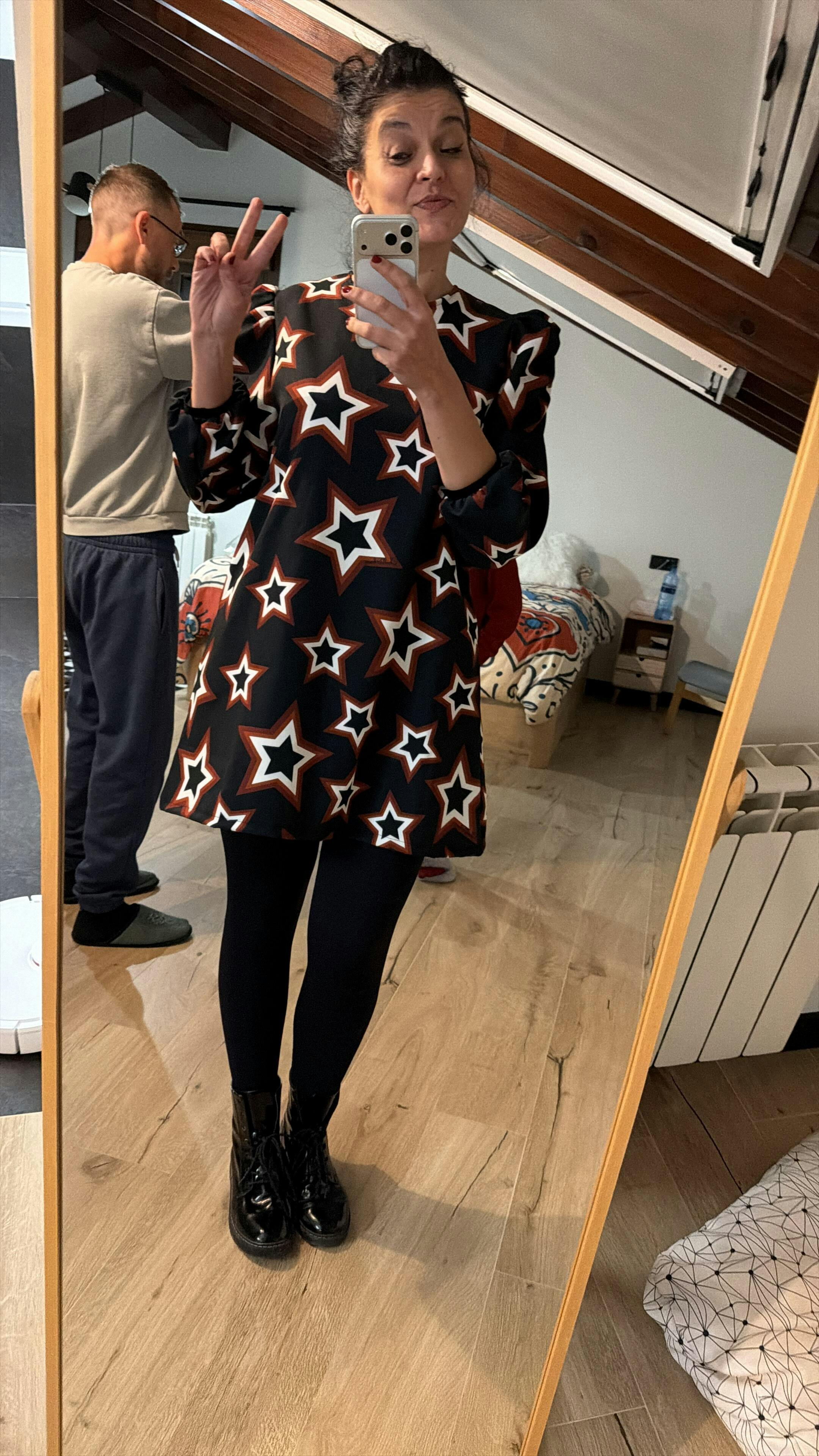 Ainara Yuste La tela del vestido es de gran calidad. El diseño de las mangas me encanta, al igual que tenga bvolsillos. La talla elegida es la correcta y sienta de maravilla. Encantada con la elección.