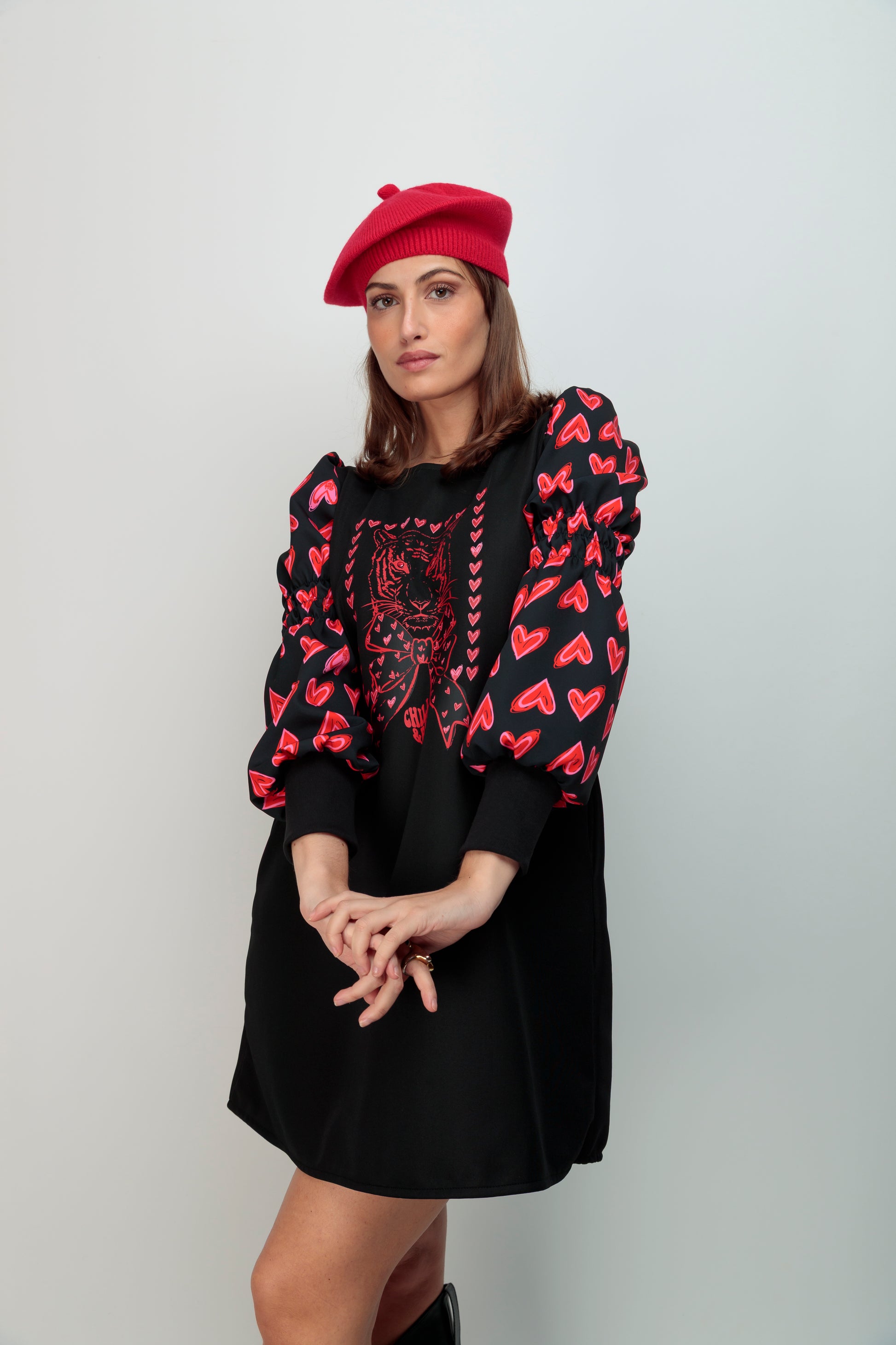 Vestido corto de mujer con cuello redondo y corte evasé que favorece la silueta. Destaca por sus bolsillos funcionales y mangas largas abullonadas con gomas ajustables en el brazo y puño de ribete. El diseño frontal presenta detalles en rojo que aportan un toque de sofisticación al negro profundo de la prenda. Perfecta para crear looks versátiles, desde casual a más elaborado, con ese detalle statement que define tu estilo.