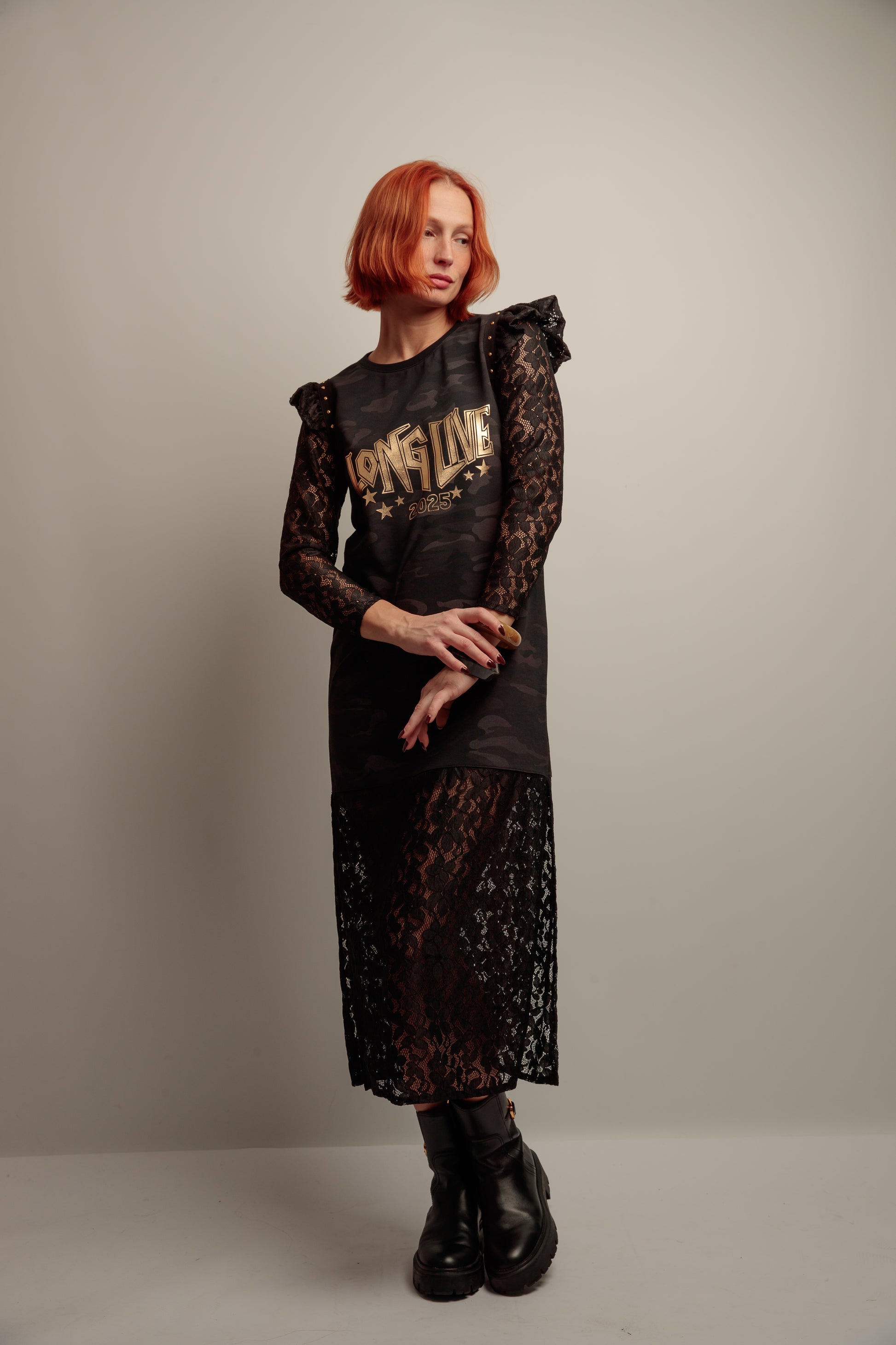Este vestido combina un estampado de camuflaje en tonos negros y grises con delicados detalles de encaje negro en el bajo, donde destacan las aberturas laterales que aportan movimiento. Sus mangas largas de encaje con volantes suman un toque femenino y divertido. Con felpa interior para una sensación cálida y cómoda, además de una llamativa estampación frontal en dorado que añade un brillo único. Perfecto para lucir con estilo y personalidad en cualquier ocasión. Confeccionado en Vigo.